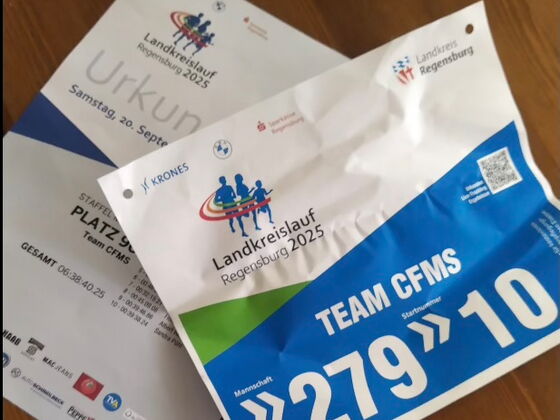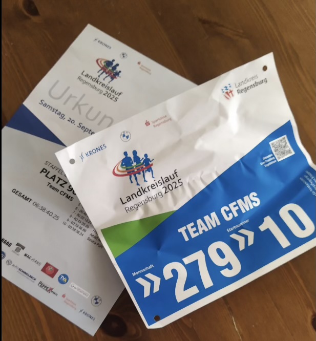 …dann heißt es wieder „Die CFMS läuft!“. Denn auch dieses Jahr wurden pünktlich zu Beginn der Sommerferien fleißig Trainings- und Fahrpläne geschmiedet, damit einer erfolgreichen Teilnahme am Landkreislauf 2025 nichts im Wege steht. Dieses Jahr bestand unser Lauf-Team aus 4 aktiven Lehrkräften der Schule und 6 ehemaligen Schülern. Bei hochsommerlichen Temperaturen und trotz intensiven Höhenmetern belegten wir einen tollen 96. Platz – endlich zweistellig.